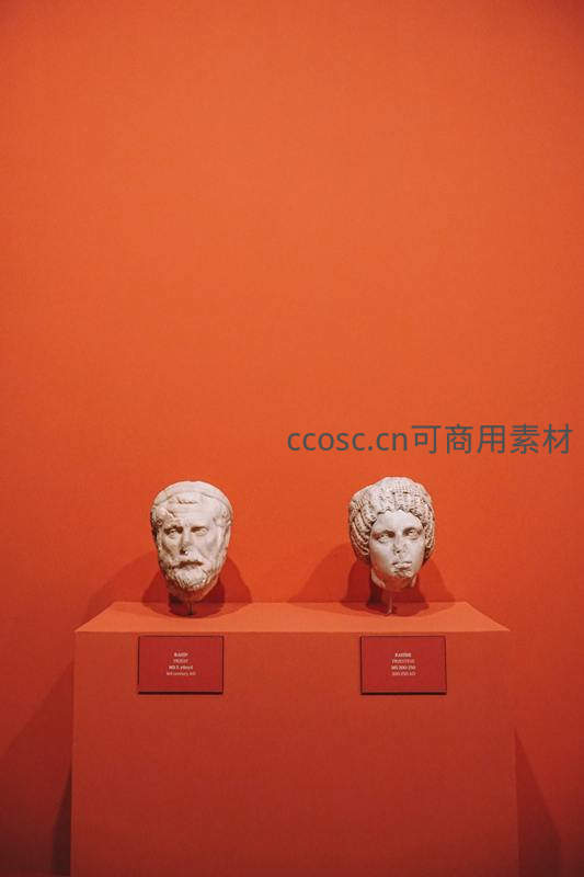 两尊古希腊风格的白色大理石头像雕塑静置于红色展台上,背景是纯橙色墙面,突显其历史厚重感与艺术美感,仿佛穿越时空的文明对话。