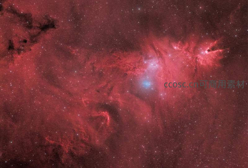 浩瀚宇宙中一片壮丽的红色星云,点缀着无数闪烁的恒星,中心区域泛着淡蓝色光芒,展现了宇宙深处的神秘与瑰丽。