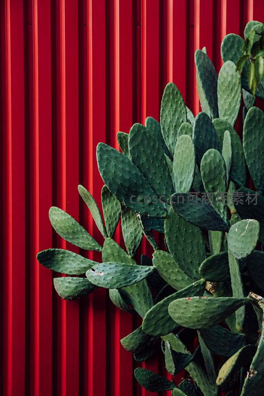 翠绿的仙人掌叶片与鲜艳的红色波纹金属墙形成强烈视觉对比,展现自然与人造环境的和谐共存。