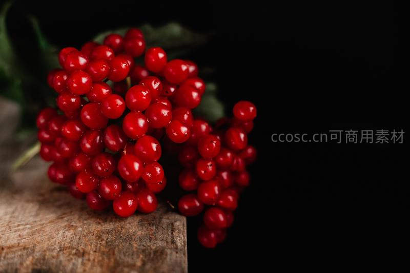 一簇饱满圆润的红色浆果放置在粗糙木板边缘,深色背景突显其鲜艳色泽,传递出自然与丰收的气息。