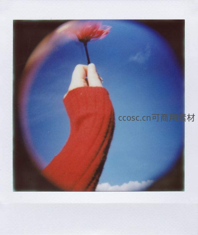 一只穿着红色毛衣的手托着一朵小花,背景是清澈的蓝天白云,采用宝丽来相框效果,充满怀旧与治愈感。