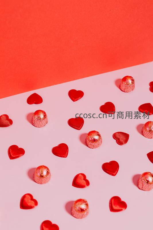 粉白双色背景上散落着红色心形糖纸和金色锡箔巧克力,营造出温馨甜蜜的情人节氛围,适合节日主题设计使用。