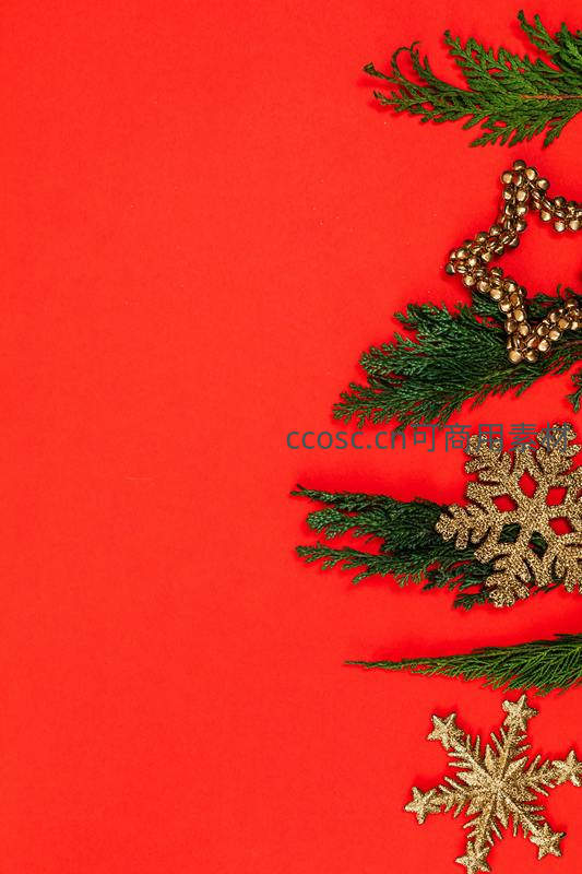 翠绿的松枝与闪耀的金色雪花、星星装饰品在红色背景上构成优雅边框,传递温馨喜庆的圣诞气息。