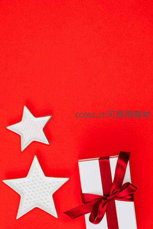 两个白色立体星星与一个系着红丝带的礼盒在红色背景上巧妙布局,简洁而充满节日祝福与仪式感。