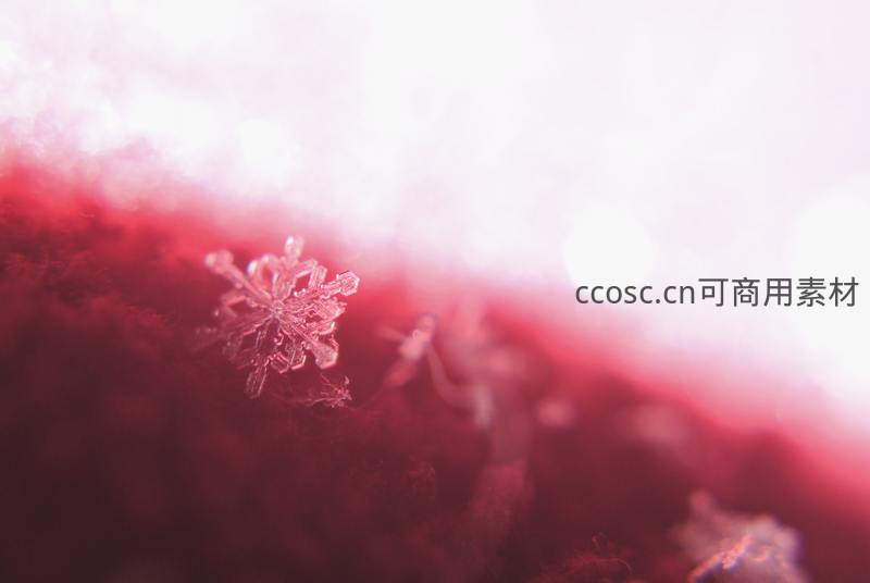 在柔和红色背景下,一朵精致雪花晶体被微距镜头捕捉,展现其六角对称结构与通透质感,充满冬日诗意与科学美感。