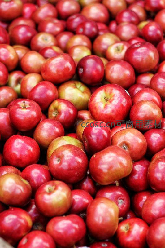 大量色泽鲜亮、圆润饱满的红苹果紧密堆叠,散发着诱人的光泽和新鲜气息,是秋季丰收与健康生活的生动写照。