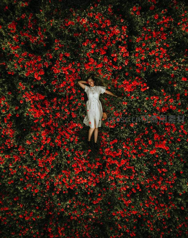 从高空俯瞰,一位身穿白裙的少女悠闲地躺在一片无垠的红色花海中央,构成一幅宁静而梦幻的自然画卷。