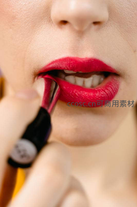 镜头聚焦于一张正在被涂抹鲜红色唇膏的嘴唇,细腻的皮肤纹理和饱满的唇形在专业光线下尽显,展现了美妆过程中的精致与魅力。