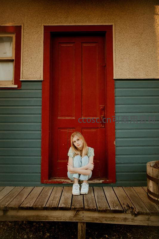 金发少女蜷坐于古朴房屋的红色门前,木质台阶与蓝绿色墙面形成色彩对比,氛围宁静而略带忧郁。