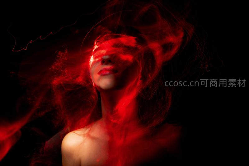 在纯黑背景下,一位女子被流动的红色光效与烟雾环绕,闭目仰头,营造出超现实、充满灵性与情绪张力的画面。