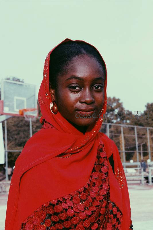 一位戴着鲜艳红色头巾的年轻女性在户外篮球场前微笑,背景是模糊的球架和树木,阳光柔和,神情温柔而自信。