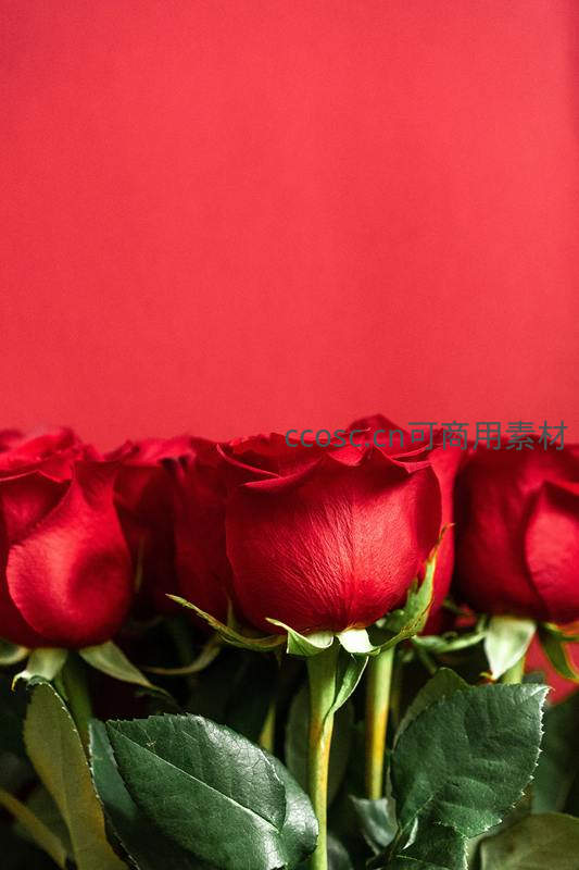 多朵红玫瑰整齐排列于纯红背景前,绿叶点缀其间,构图简洁而富有冲击力,展现花卉的自然美与设计感,适合用于节日或装饰场景。