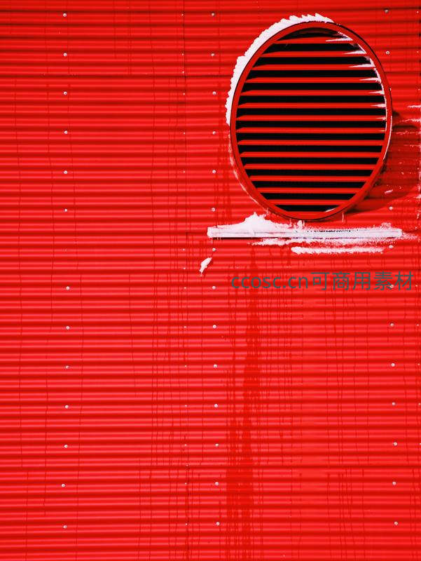 一张充满工业美学的特写照片,展示了鲜艳红色波纹金属板上一个圆形通风口的细节,白色积雪点缀其边缘,形成强烈的色彩与质感对比。