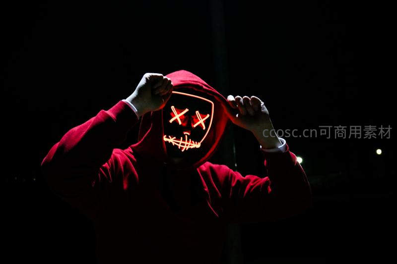 在漆黑背景下,一人身着红色连帽衫,佩戴着发出红光的骷髅面具,营造出诡异而神秘的万圣节氛围。