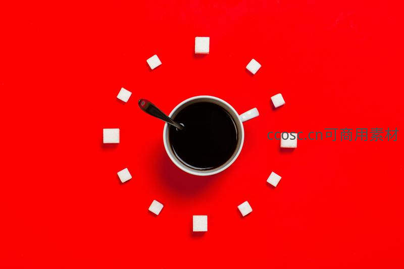 纯红背景下,一杯黑咖啡居中,周围环绕十二颗方糖模拟时钟刻度,勺子作为指针,构图简洁富有设计感,寓意悠闲时光。