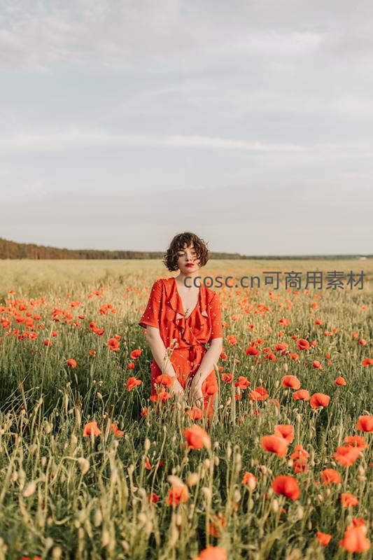 红裙女子伫立在无垠的罂粟花丛中
