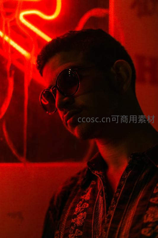 霓虹灯下戴墨镜的时尚男子侧影