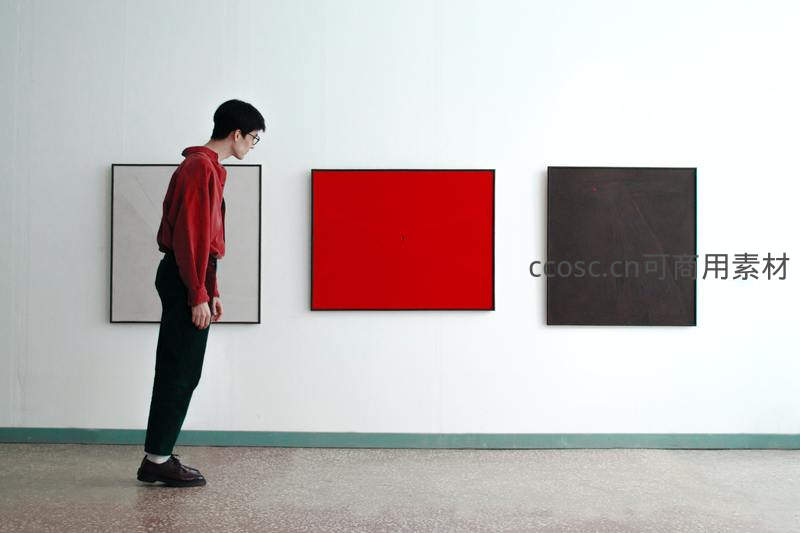 青年驻足凝视美术馆红色抽象画