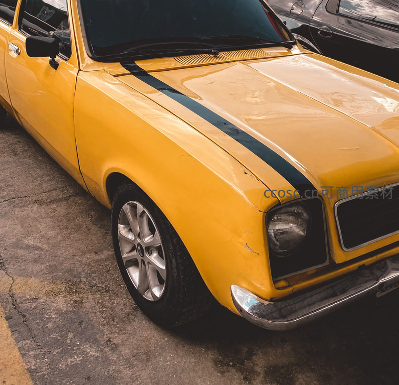 一辆经典的黄色复古轿车停在街头,镜头聚焦于其光洁的引擎盖和醒目的黑色条纹,银色轮毂与车身光泽相映成趣,散发着浓郁的怀旧工业美学气息。