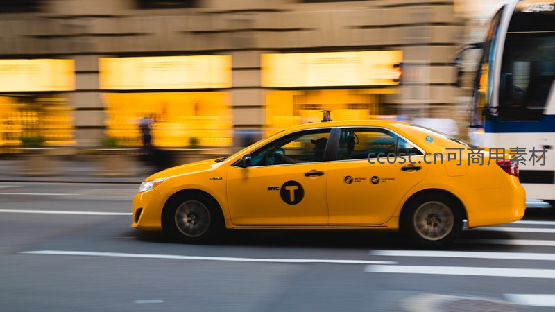 一辆标志性的纽约黄色出租车在繁华街道上飞驰而过,背景建筑因速度产生动感模糊,展现了都市的快节奏与活力。