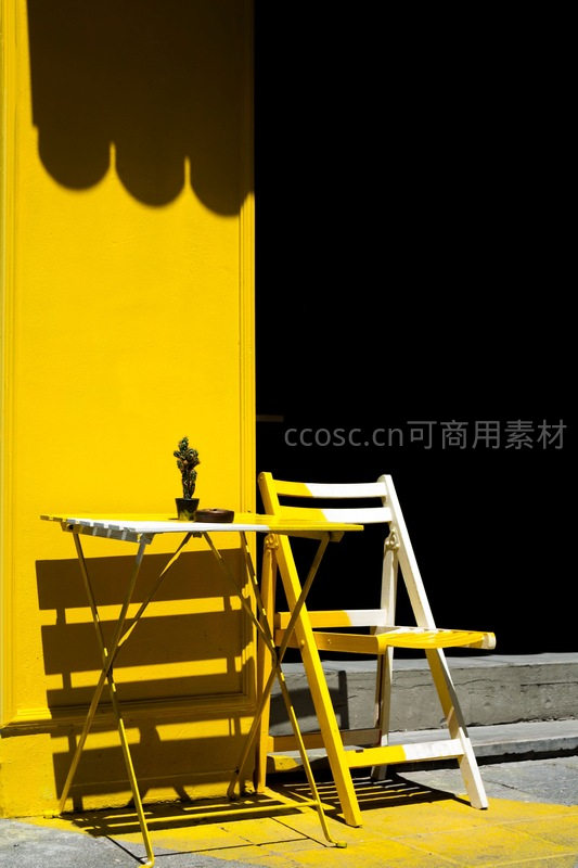 阳光洒在明黄色的墙角,一张白色折叠桌和一把黄白相间的椅子静静摆放,桌上一盆小仙人掌增添生机,强烈的光影对比营造出宁静而现代的氛围。