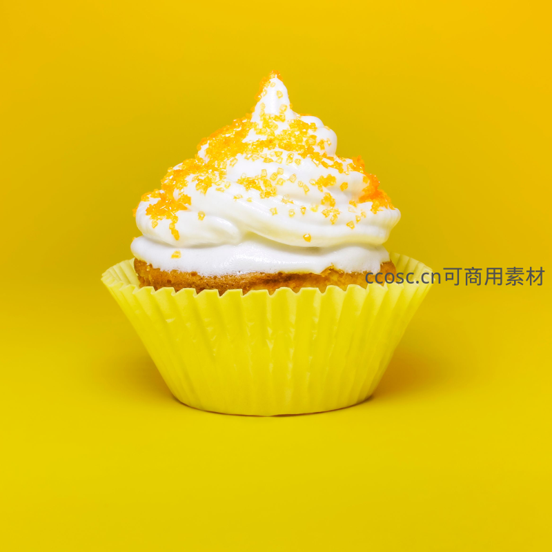 一个精致的纸杯蛋糕,顶部覆盖着蓬松的白色奶油,并撒上闪亮的橙色糖珠,置于明亮的黄色背景中,充满甜蜜诱惑。