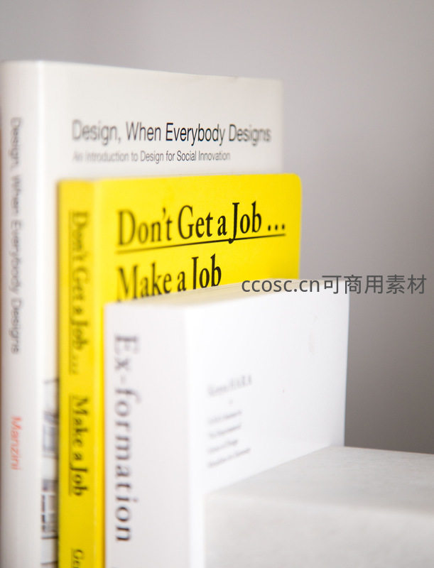 三本设计类书籍以交错方式堆叠摆放,其中一本亮黄色封面的《Don't Get a Job... Make a Job》尤为醒目,营造出浓厚的知识与创意氛围。