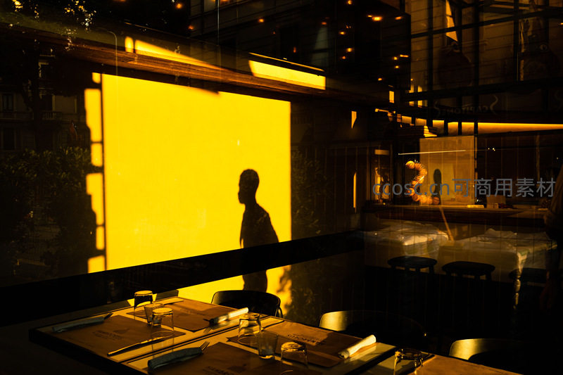 透过玻璃窗,暖黄色的灯光映照出人物的剪影,与餐厅内整齐摆放的餐具形成静谧而温馨的画面,营造出独特的都市夜生活氛围。