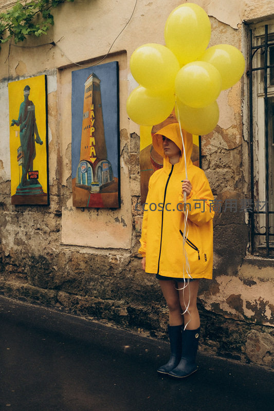 一位身穿亮黄色雨衣的少女站在斑驳的墙边,手中握着一束同样鲜艳的黄气球,背景是充满艺术气息的街头壁画,氛围温馨又带点怀旧。