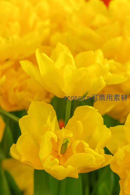 特写镜头下,鲜艳的金黄色郁金香层层叠叠,花瓣柔美舒展,绿茎挺拔,充满盎然春意与生命活力。