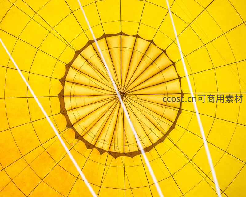 从热气球底部向上仰拍,展现其内部黄色织物与支撑绳索构成的放射状几何图案,充满视觉冲击力和结构美感。