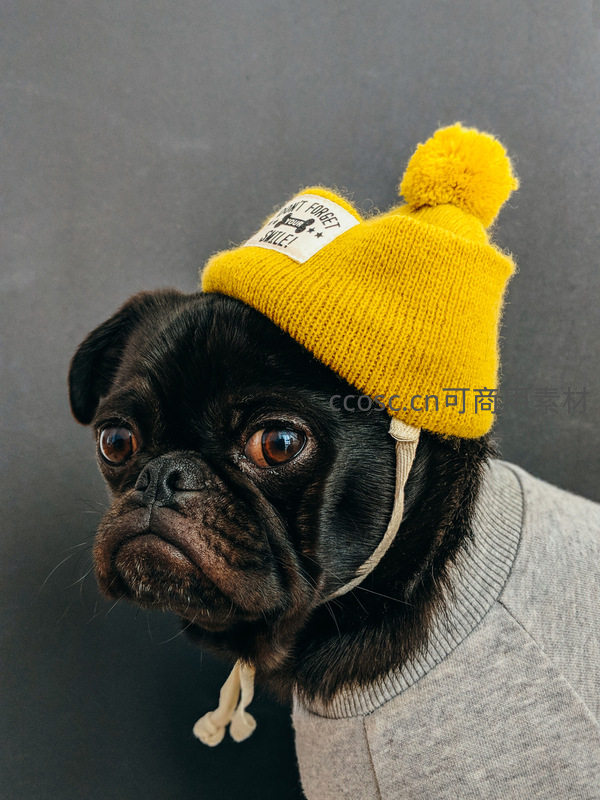 一只可爱的黑色巴哥犬身穿灰色毛衣,头戴一顶亮黄色毛线帽,表情呆萌,眼神无辜,背景为深灰,突出其俏皮又温暖的形象。