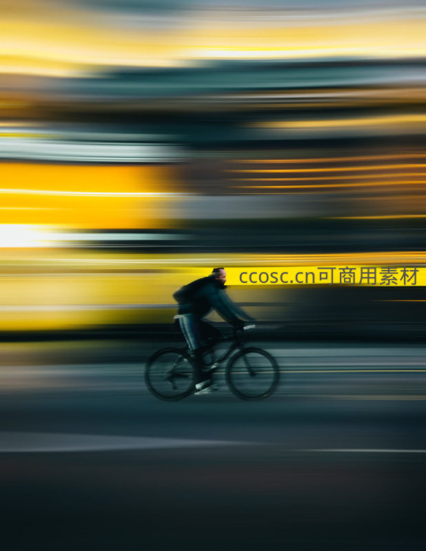 一名骑行者在强烈的动态模糊效果中疾驰而过,背景是流动的黄昏光影,展现出速度与力量的视觉冲击力。