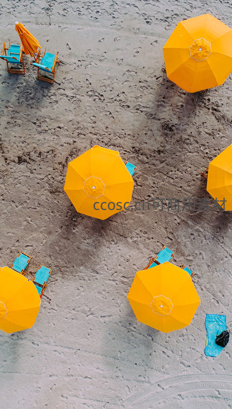 航拍视角下的沙滩与明黄遮阳伞