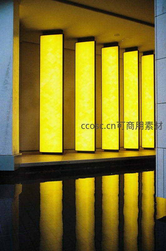 现代建筑内发光的黄色竖条灯柱