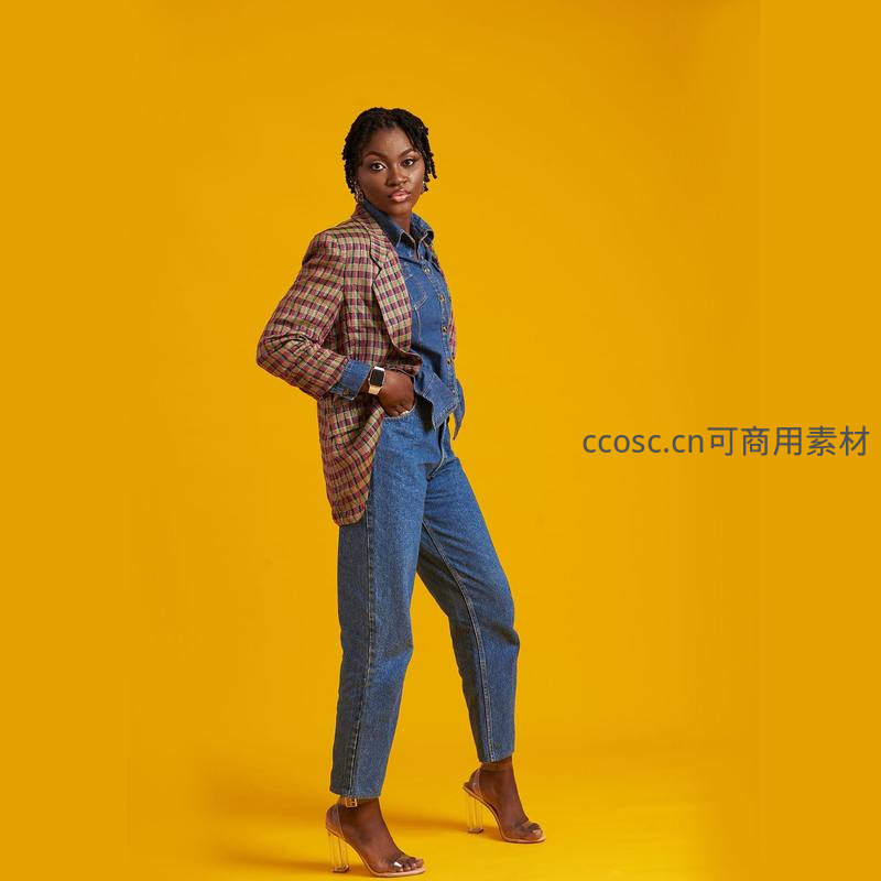 黑发女性身穿格纹西装外套搭配蓝色牛仔裤和透明高跟鞋,在黄色背景前展示自信姿态,体现都市时尚与个性风格。