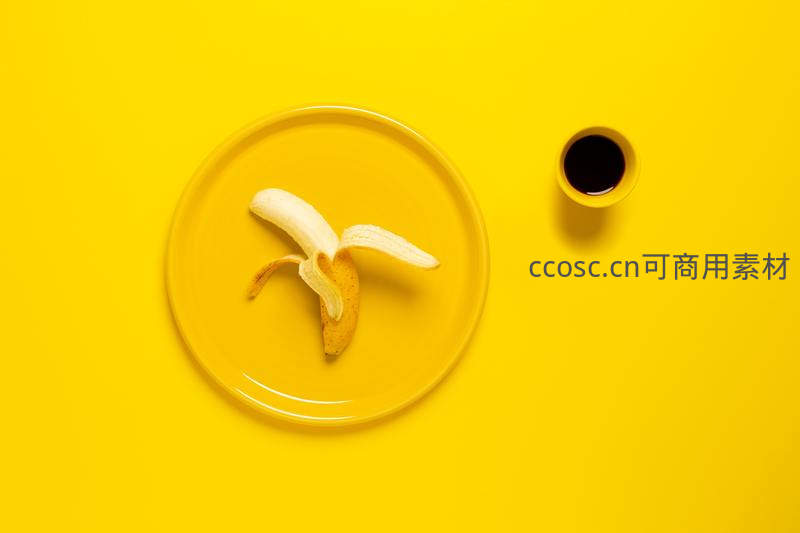 纯黄色背景上,一个透明盘子盛放着剥开的香蕉,旁边是一杯黑咖啡,构图简洁,色彩统一,传递出健康、宁静的早晨生活方式。