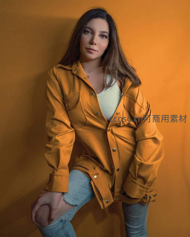 一位年轻女性身着亮眼橙色工装外套和破洞牛仔裤,在纯色背景墙前摆出自信姿态,展现了现代都市青年的时尚与个性。