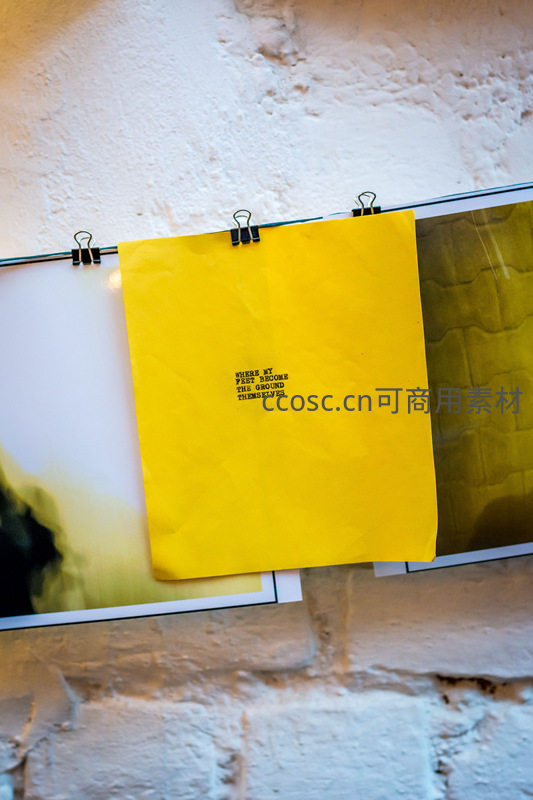 一张醒目的黄色纸张被黑色夹子固定在画框上,上面印有英文诗句,背景是斑驳的白色砖墙,营造出一种文艺且富有创意的氛围。