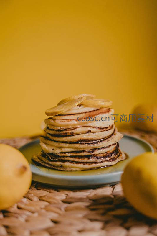 一叠金黄诱人的松饼淋上糖浆,顶部点缀着柠檬片,置于浅蓝色盘中,背景为温暖的黄色,营造出温馨可口的早餐氛围。