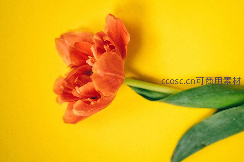 一朵盛开的橙色郁金香在纯黄色背景下显得格外鲜艳,花瓣层次分明,绿茎与叶片衬托出自然生机,充满春日活力与艺术美感。