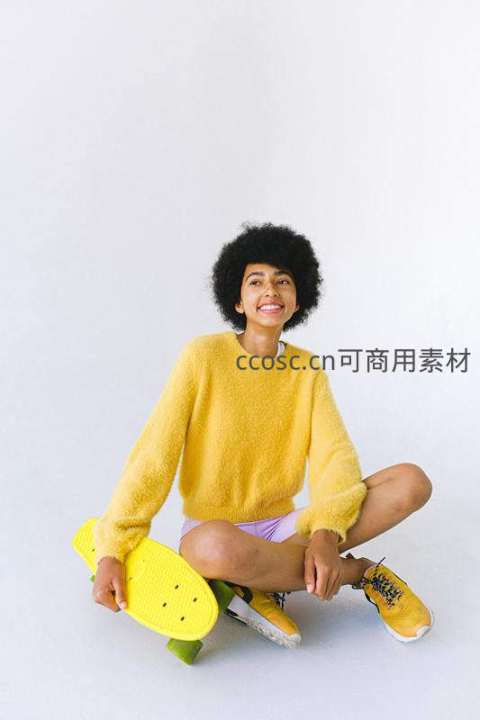 一位穿着黄色毛衣的女孩盘腿坐在地上,怀抱黄色滑板,面带灿烂笑容,整体画面充满活力与青春气息。