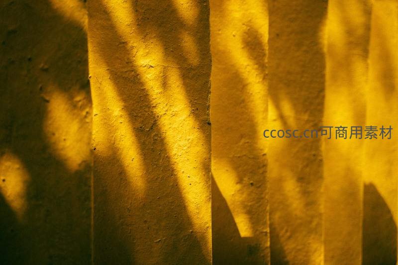 温暖的阳光透过树叶,在粗糙的墙面上投下斑驳的条状阴影,营造出宁静而富有诗意的视觉效果。