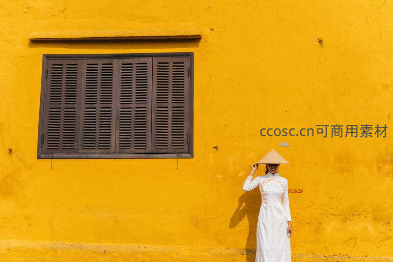 一位身着白色越南奥黛、头戴斗笠的女子站在明黄色的古建筑墙前,展现出浓郁的东南亚传统风情与人文之美。