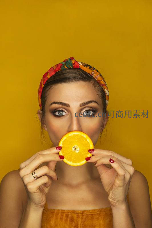 女子手持橙片遮面,黄色背景衬托明媚笑容