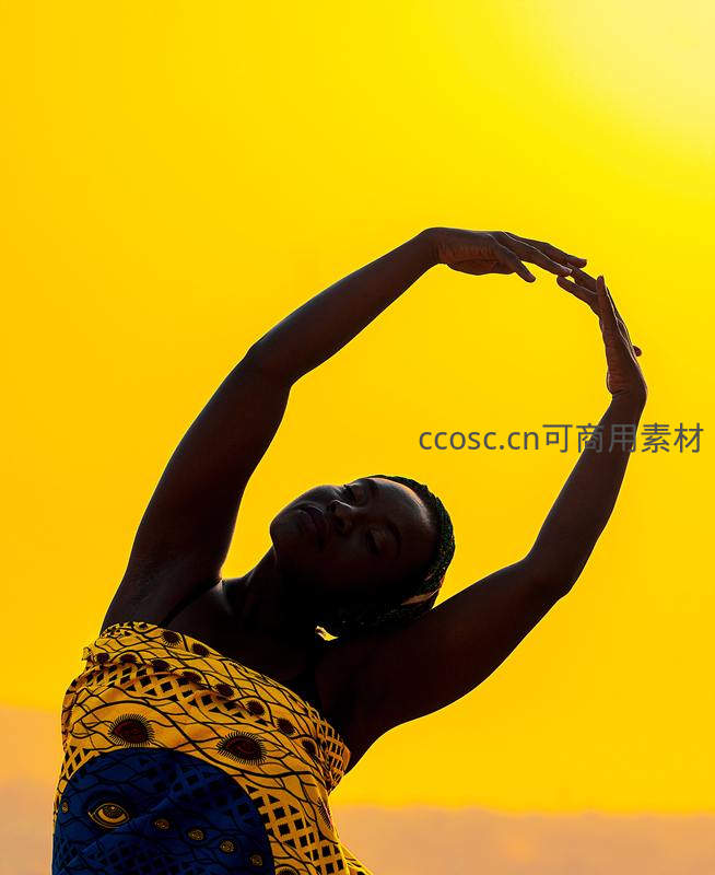 一位身着图案服饰的女性在纯黄色背景前舒展双臂,形成优美的弧线,姿态宁静而充满韵律感,传递出自由与艺术的气息。