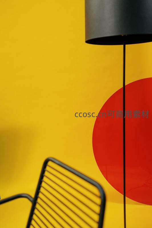 画面聚焦于一盏黑色落地灯与墙面上巨大的红色圆形图案,背景为明亮的黄色,前景是黑色金属椅背,构成一幅充满几何美感与现代设计感的画面。
