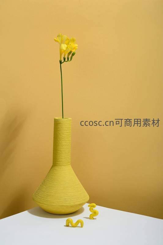 一支娇嫩的黄色小花插入具有独特横向纹理的黄色花瓶中,简洁构图与柔和光影营造出宁静致远的艺术氛围,适合家居装饰灵感。