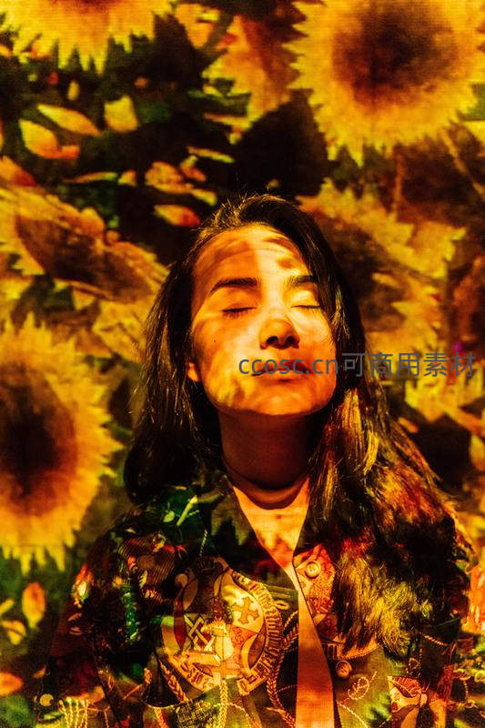 一位女子在向日葵图案的光影下闭目沉思,温暖的色调与面部轮廓交织,营造出梦幻而宁静的艺术氛围。