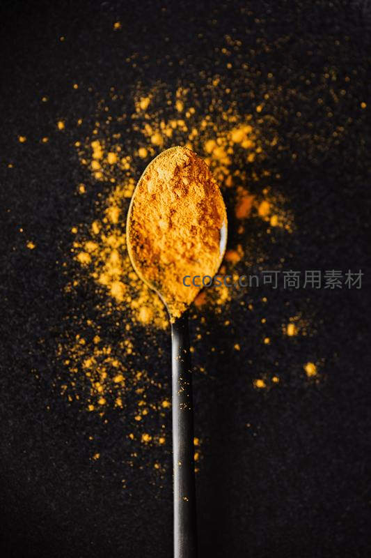 一把黑色小勺盛满金黄色粉末,部分粉末如星尘般散落在深邃背景上,突出食材的浓郁色泽与料理的精致感。